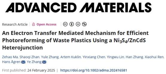 近日,南華大學(xué)化學(xué)化工學(xué)院張也教授團(tuán)隊(duì)在材料科學(xué)領(lǐng)域頂級(jí)期刊Advanced Materials(影響因子27.4,中科院一區(qū))發(fā)表了題為"An electron transfer mediated mechanism for efficient photoreforming of waste plastics using a Ni3S4/ZnCdS heterojunction"的研究論文。該研究創(chuàng)新性地構(gòu)建了非貴金屬Ni3S4/ZnCdS異質(zhì)結(jié)光催化體系,系統(tǒng)探究了其在廢塑料光重整中的應(yīng)用性能與機(jī)制。研究表明,Ni3S4與ZnCdS之間形成了高效的單電子轉(zhuǎn)移通道,實(shí)現(xiàn)了光生電荷載流子的空間分離,顯著提升了塑料降解產(chǎn)物的選擇性和氫氣(H2)的生成效率。