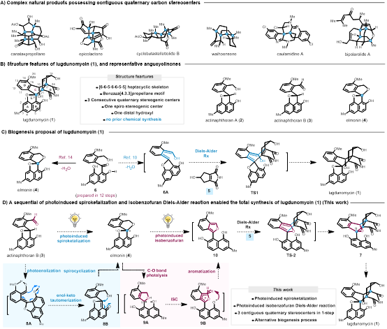 天然產物長期以來一直是藥物發現的重要來源。具有復雜空間結構、生物活性顯著的分子,尤其是人們關注的熱點。天然產物分子結構中連續季碳立體中心(CQS)的存在顯著增加了分子的復雜性和多樣性,而特殊的空間結構往往會表現特別的生物活性。然而,連續季碳立體中心的構建,尤其是當存在于多元并環和橋環復雜結構中時,是天然產物全合成中最具挑戰性的難題之一。該策略展示了光誘導Diels-Alder反應構建多個連續季碳立體中心的優勢,為其他復雜天然產物,特別是對于含有多個連續季碳立體中心的分子的合成提供了新的思路,展示了其在相關天然產物全合成中的廣泛應用前景。