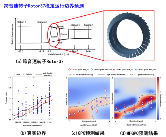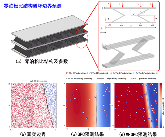 將所提方法應用于近零泊松比結構的失效邊界和壓氣機轉子安全運行邊界的預測。預測結果如下兩圖顯示。所提方法的建模精度和速度均優于現有模型,驗證了所發展方法的有效性和工程實用性。所提方法還能為多可信度貝葉斯優化算法提供新型的可行域邊界預測途徑。
