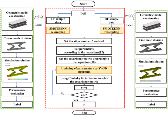 近日,南華大學機械工程學院何有為博士團隊在計算機科學領域中科院一區top期刊Engineering Applications of Artificial Intelligence上發表了題為“An efficient boundary prediction method based on multi-fidelity Gaussian classification process for class-imbalance”的研究論文。該論文介紹了一種基于多保真度高斯分類過程的邊界預測方法,旨在利用多保真度建模范式降低邊界預測模型的建模代價和提升類不平衡時邊界預測模型的建模精度。研究生劉凌志和談寬為參與作者,何有為博士為通訊作者,南華大學機械工程學院為論文署名單位。邊界預測是工程設計過程中不可避免的問題,失效與安全極限狀態之間的這類邊界預測是其中最熱門的研究課題之一。囿于物理實驗成本高昂、周期長的局限性,基于代理模型的邊界預測方法常被用于邊界的快速預測。在眾多代理模型中,高斯分類過程(GPC)被廣泛使用。但是,其僅可利用獲取代價高昂的高可信度數據,導致建模數據的獲取代價高昂。為降低建模數據獲取代價,基于多可信度建模范式發展了多可信度高斯分類過程(MGPC)。它使用大量的廉價低可信度樣本點來捕捉工程系統的整體趨勢,進一步使用少量昂貴高可信度樣本點對其進行校正,從而在保證較高建模精度的同時降低模型時間。其次,現有GPC主要利用馬爾可夫鏈蒙特卡洛采樣(MCMC)方法開展模型訓練,導致其建模過程計算量大且收斂速度較慢。為此,提出了基于斯坦因變分梯度下降(SVGD)訓練方法的改進MGPC模型(MGPC-SVGD)。再次,在工程邊界預測問題中,MGPC還會受到因樣本點難以獲取或邊界劃分不均勻等誘發的類別不平衡現象,對模型精度造成損害。針對該問題,植入了合成少數類過采樣方法與編輯最近鄰耦合的混合采樣方法,降低建模數據的類不平衡率,建立了基于MGPC的邊界預測方法,流程如下圖所示。