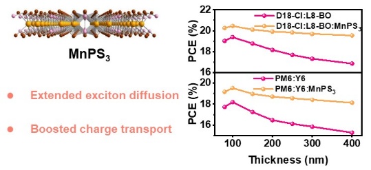 為突破這一厚度-效率制約的根本性難題,本研究通過(guò)液相剝離法制備單層MnPS3納米片,借助多模態(tài)表征證實(shí)其可有效擴(kuò)展激子擴(kuò)散距離并提升面外電荷遷移率。單層MnPS3納米片輔助作用下基于PM6:Y6體系的有機(jī)太陽(yáng)電池實(shí)現(xiàn)了19.53%(100 nm厚度)和18.41%(300 nm厚度)的破紀(jì)錄功率轉(zhuǎn)換效率,展現(xiàn)出94.3%的超高膜厚耐受性,創(chuàng)造了有機(jī)太陽(yáng)電池領(lǐng)域的最高膜厚耐受性紀(jì)錄。該策略的普適性進(jìn)一步在D18-Cl:L8-BO體系(100 nm / 300 nm厚度:20.45%/19.70%功率轉(zhuǎn)換效率)和D18:L8-BO體系(100 nm / 300 nm厚度:20.41%/19.62%功率轉(zhuǎn)換效率)得到驗(yàn)證,其膜厚耐受性均超越現(xiàn)有的頂級(jí)有機(jī)太陽(yáng)電池。此項(xiàng)工作為解決工業(yè)級(jí)有機(jī)太陽(yáng)電池制造中光子捕獲與電荷提取的核心矛盾提供了普適性設(shè)計(jì)原則,為有機(jī)太陽(yáng)電池實(shí)現(xiàn)商業(yè)化“卷對(duì)卷”印刷生產(chǎn)奠定了理論與實(shí)驗(yàn)基礎(chǔ),具有重要的科學(xué)意義和應(yīng)用前景。