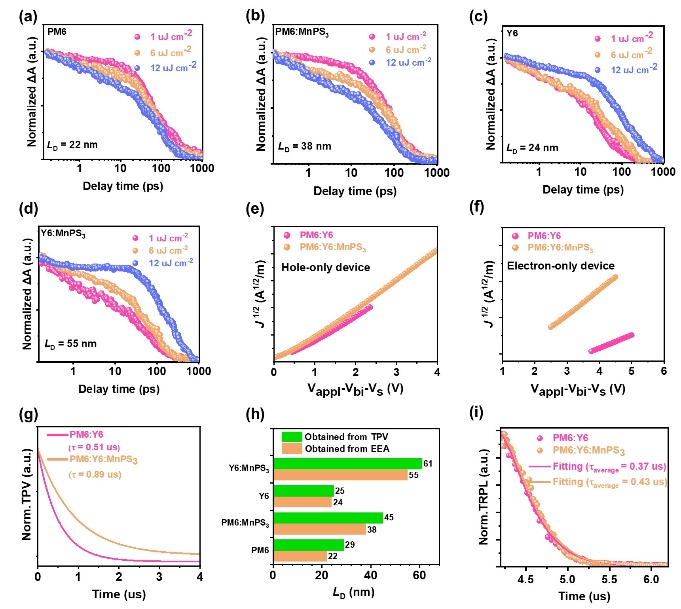 圖2. MnPS3納米片作用下有機(jī)太陽(yáng)電池的激子擴(kuò)散長(zhǎng)度以及電荷傳輸動(dòng)力學(xué)