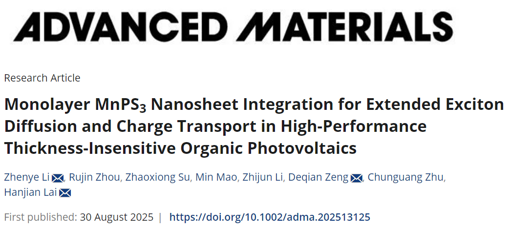 近日,南華大學(xué)機(jī)械工程學(xué)院李振業(yè)教授團(tuán)隊(duì)在材料科學(xué)領(lǐng)域頂級(jí)期刊Advanced Materials(影響因子26.8,中科院一區(qū)top)上發(fā)表了題為“Monolayer MnPS3 Nanosheet Integration for Extended Exciton Diffusion and Charge Transport in High-Performance Thickness-Insensitive Organic Photovoltaics”的重要研究成果。該研究創(chuàng)新性地利用單層MnPS3納米片輔助增強(qiáng)電池器件的激子擴(kuò)散和電荷傳輸,制造出在100-300 nm光敏層厚度范圍具有超高膜厚耐受性(94.3%)的有機(jī)太陽(yáng)電池,對(duì)推動(dòng)有機(jī)太陽(yáng)電池實(shí)現(xiàn)大規(guī)模卷對(duì)卷生產(chǎn)具有重要的科學(xué)價(jià)值。李振業(yè)教授為論文獨(dú)立第一作者、其指導(dǎo)的碩士研究生周如進(jìn)為論文第二作者,李振業(yè)、曾德乾和賴(lài)寒健為論文共同通訊作者,南華大學(xué)機(jī)械工程學(xué)院為論文第一署名單位。