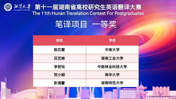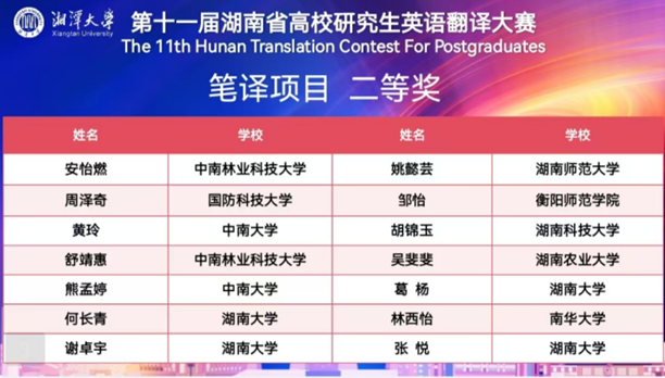 11月9日,第十一屆湖南省高校研究生英語翻譯大賽在湘潭大學圓滿落幕。經過激烈角逐,南華大學研究生團隊在此次大賽中取得歷史突破性的佳績,賀小穎(指導老師王一鳴)、林西怡(指導老師胡大偉)分別榮獲筆譯項目一等獎和二等獎,為學校贏得了榮譽。