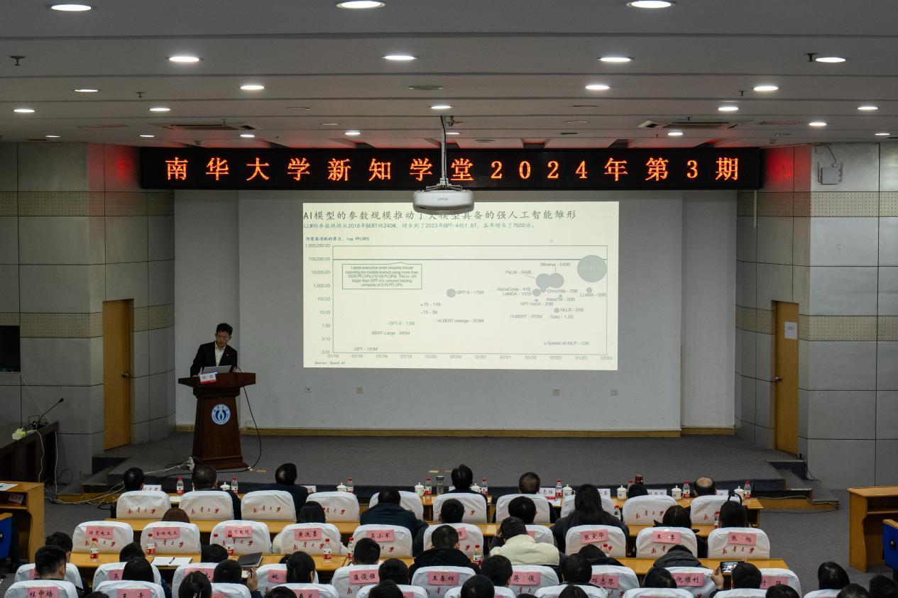 本期新知學堂邀請南華大學創新研究院學科領軍人才、電氣工程學院教授何弢主講。他以“大模型技術和下一代智能機器人”為題,從“第四次工業革命”的概念引入,詳細分析了大模型和人工智能的發展現狀和趨勢,全面介紹了全球AI技術及商業應用的最新進展,并對中國AI技術發展及商業應用進行了展望。通過視頻,何弢向大家展示了端到端自動駕駛技術、不同形態的智能機器人進行公共服務與家居服務的美好場景。何弢表示,隨著4.0人工智能革命時代到來,全球AI生態迅速發展,GPT4.5、OPENAI、GOOGLE的GEMINI、TESLA的全棧AI、LLAMA2、AI AGENT等新的技術模型不斷涌現,在智能汽車、企業服務、AI創作、社交應用、視頻生成,特別是人形機器人和具身智能等領域展現了其長遠的應用價值;大模型、人形機器人的發展將會重塑全球產業結構,顛覆制造業格局,并加速新質生產力的實現。同時,何弢還結合南華大學核、醫等學科特色,就如何運用大模型技術與人工智能提出了建議。