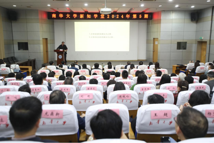 4月9日晚,南華大學新知學堂2024年第5期在紅湘校區圖書館開講。校黨委書記高山出席。校長張灼華以“University,limx→∞1/x=0”為題作專題報告。校黨委副書記雷小勇主持。