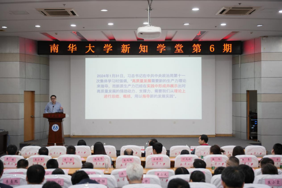 4月23日晚,南華大學新知學堂2024年第6期在紅湘校區圖書館開講。哈爾濱工業大學(深圳)材料科學與工程學院和經濟管理學院雙聘教授、區塊鏈發展研究院院長、材料基因與大數據研究院副院長林熹應邀來校,以《高質量發展的基石:新質生產力》為題為在場師生作學術報告。校黨委書記高山出席。校黨委委員、紀委書記劉杏花主持。