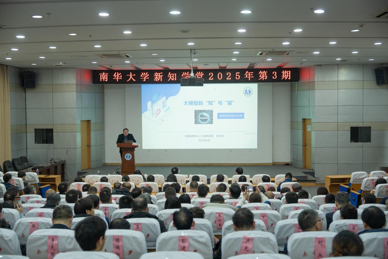 3月12日晚,南華大學新知學堂2025年第3期在紅湘校區圖書館一樓新知學堂舉行。南華大學網絡信息中心主任劉志明教授以“大模型的‘知’與‘能’”為題,為在場干部作專題報告。校黨委委員、副校長陳國民主持報告會。全體在校校領導、黨委委員出席。
